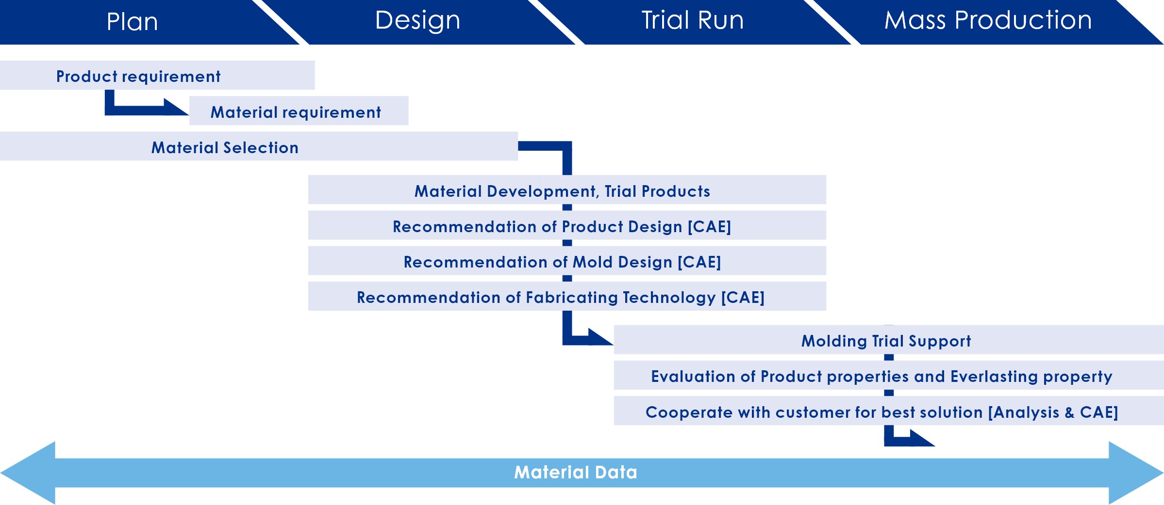 Toray’s Resin Division provides comprehensive solutions to our valued customers and full process support from planning to mass production. Our experts work closely with your engineers to understand your product needs so we can provide the best proposals for material selection, failure analysis, molding evaluation, product design and more.