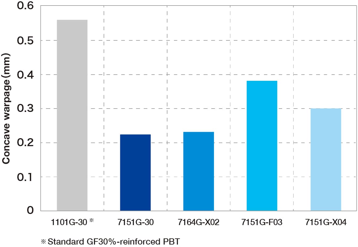 Im Vergleich zu gewöhnlichem PBT haben wir Materialien mit weiter reduziertem Verzug entwickelt, darunter die Type 7151G-30 mit deutlich reduziertem Verzug, die hydrolysebeständige Type 7151G-X04 sowie die flammhemmende und hydrolysebeständige Type 7164G-X02.