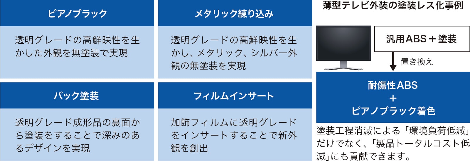 トヨラック™透明グレードの幅広いラインナップと、様々な加工法を組み合わせることにより、新意匠をご提案いたします。 また塗装工程削減による「製品トータルコスト低減」「環境負荷低減」が実現できます。