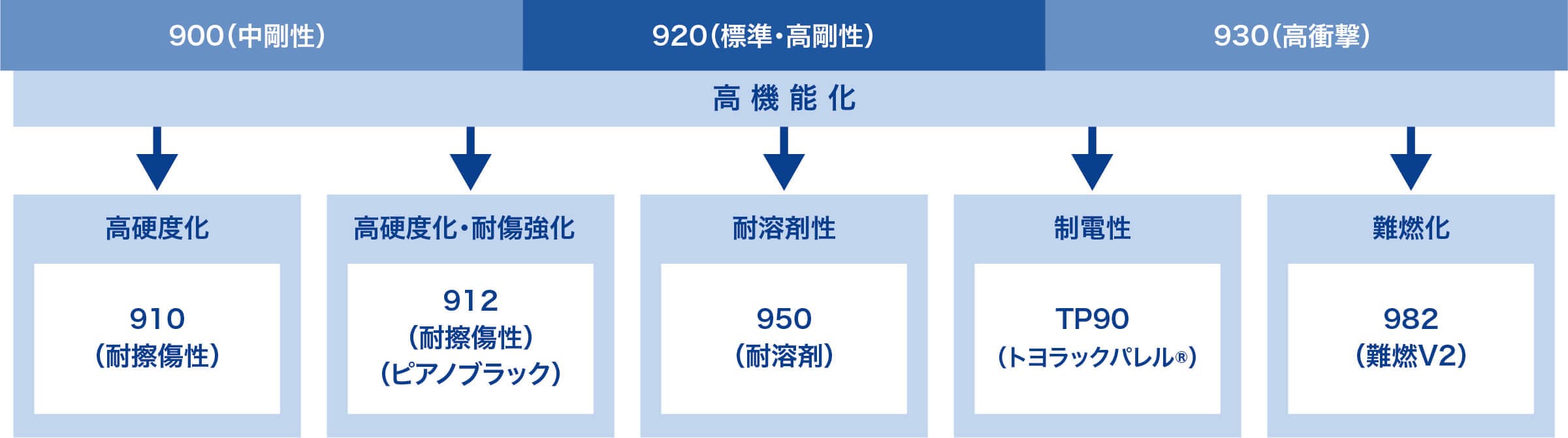 トヨラック™透明グレードには、様々な機能を追加したグレードラインナップがあり、幅広い用途への適用が可能です。