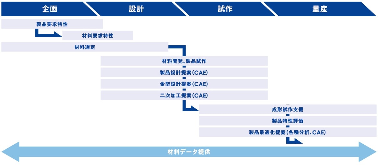 わたしたちは、大切なお客様の課題解決に向け、企画から量産までの包括的なソリューションを提供します。お客様との技術交流を通じて、製品開発にとって何が必要かを一緒に考え、最適な材料選定、数値解析、成形性評価、製品設計を提案します。