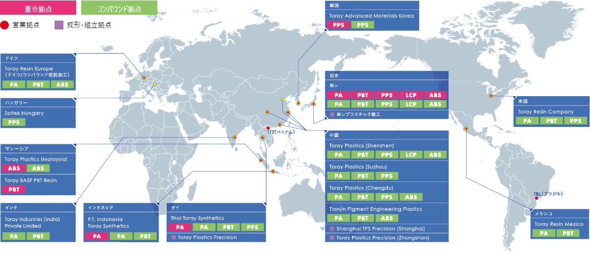 私たちは、世界中のお客様に最適なソリューションを提供するため、重合拠点、コンパウンド拠点、成形・組立拠点、営業拠点と多岐にわたるグローバルネットワークを築いています。