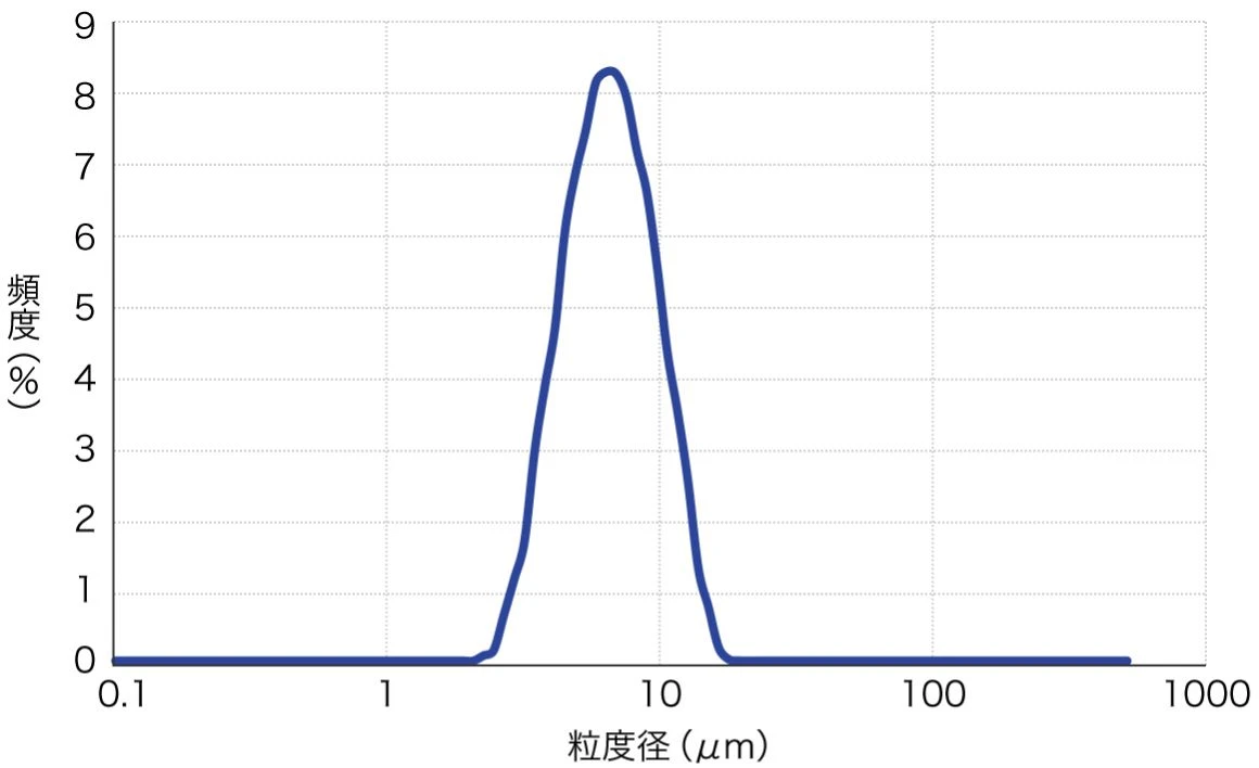 非常にシャープな粒度分布を示し、均一な粒子サイズをもちます。このため、優れた分散性をもち、製品の品質を安定させることで、化粧品用途やフィルムのアンチブロッキング材、半導体封止材や接着剤に適します。平均粒径は、約5㎛(SP500)と約10㎛(SP10)の2グレードを展開しています。