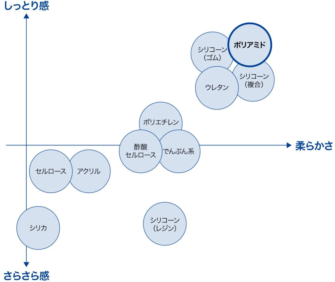 ナイロン12微粒子(PA12)は化粧品の感触改良材として50年以上の歴史を有しています。感触改良材として使用される粒子のなかでも、最終製品の「しっとり感」や「柔らかさ」が特に優れていると評価されており、ファンデーション、カラーコスメ、日焼け止め、ヘアスプレー、クリームなど、幅広い用途で採用されています。