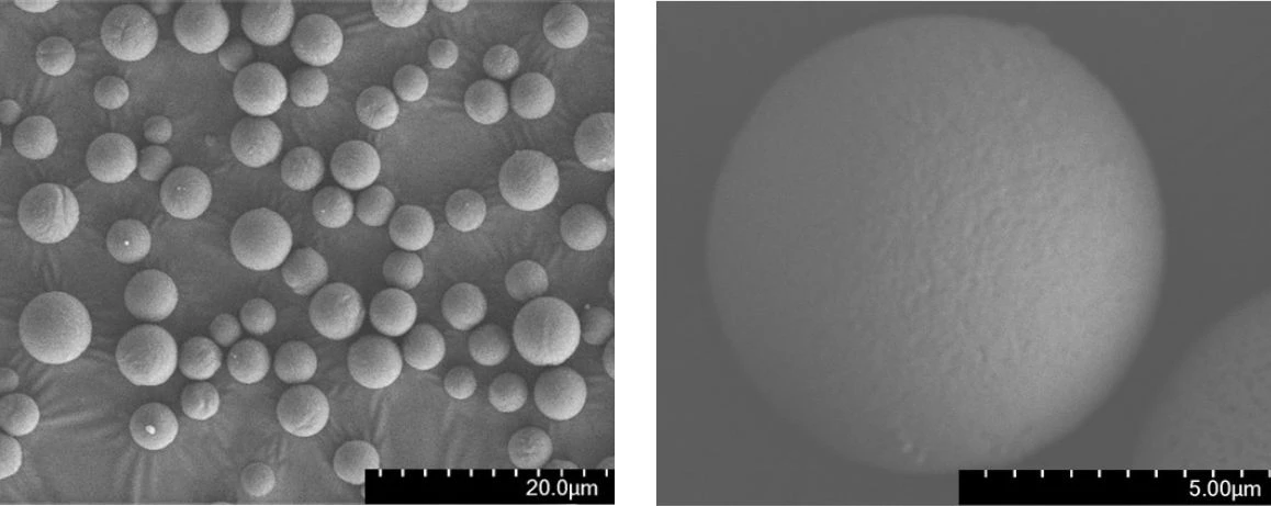 当社独自のポリマー設計技術により、真球状の粒子作製を実現。粒子表面も平滑であり、非常に整った粒子形状をしています。 平滑な真球形状を有することで、摩擦を最小限に抑えることができ、伸びの良さや滑らかさに寄与します。これら特徴によって、長年化粧品分野では感触改良材として使用されてきました。