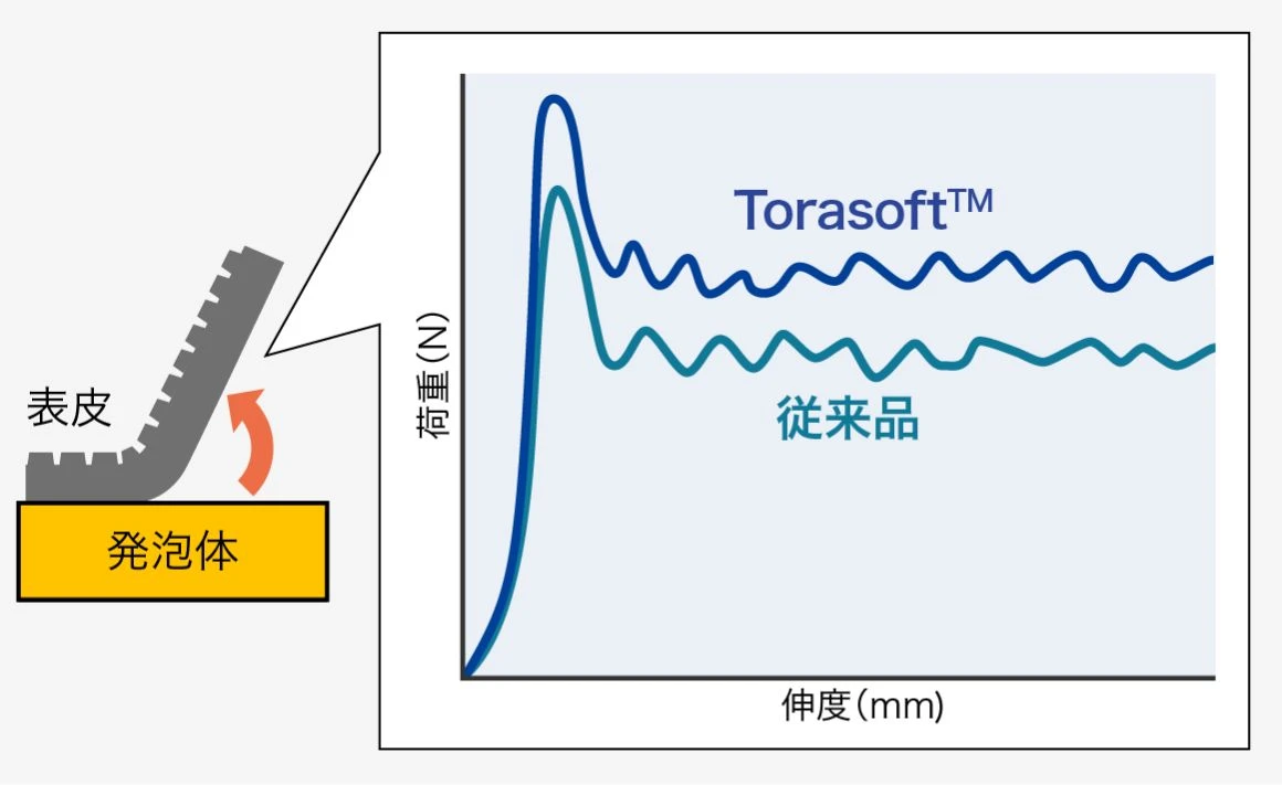 ポリオレフィン発泡体 トーレペフ™ではスコアレスエアバック対応発泡体もラインナップしています(Torasoft™) 。このグレードでは、独自処方によりTPO表皮との接着強度を向上させ、エアバック展開性速度向上と展開時の剥離抑制を両立しました。