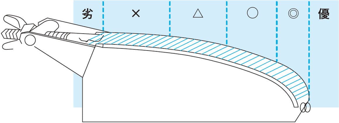 ¼楕円治具耐薬試験(図)を行い、治具に試験片がセットされた状態でのクラック発生位置(←青矢印)により4段階(☓、△、◯、◎)で優劣を判断。
