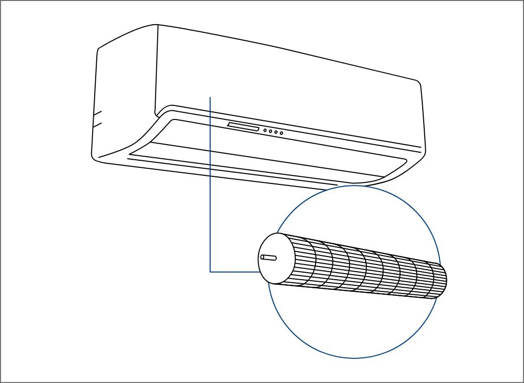 エアコン室内機に内蔵されるクロスフローファンは、部屋の空気を吸い込み、熱交換器を通して温度調節した空気を吹き出します。広範囲に均一に風を送ることができるため、部屋全体を快適な温度に保ちます。