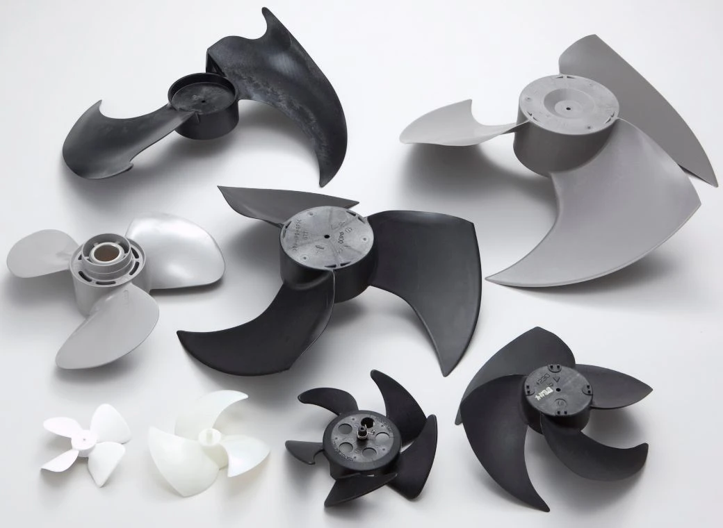 エアコンの室外機などで広く使用されるプロペラファンは、大きく設計された羽根が大風量を実現し、送風機能を支えています。効率的な送風、空気循環、直撃風の防止、さらには騒音軽減にも貢献する重要な役割を持ち、長期間にわたる使用に耐えるため、精密な成形と高い耐久性が求められます。