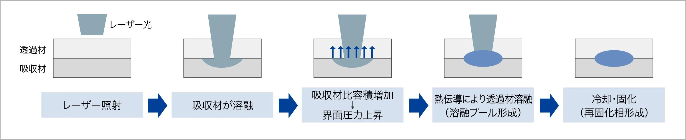 貼り合わせる予定の樹脂成型品の片方を光の透過率が高い「透過材」、もう片方の光を吸収する「吸収材」で成型し、2つを合わせた状態で透過材の側からレーザーを照射。これによりまず吸収剤表面が熱を持ち溶融、その熱が伝わって透過材の表面も溶けるため、最後に冷やすことで溶着できる。溶ける範囲は樹脂の接合面にとどまるため、成型品のゆがみが生じにくく、高い強度を得やすい。
