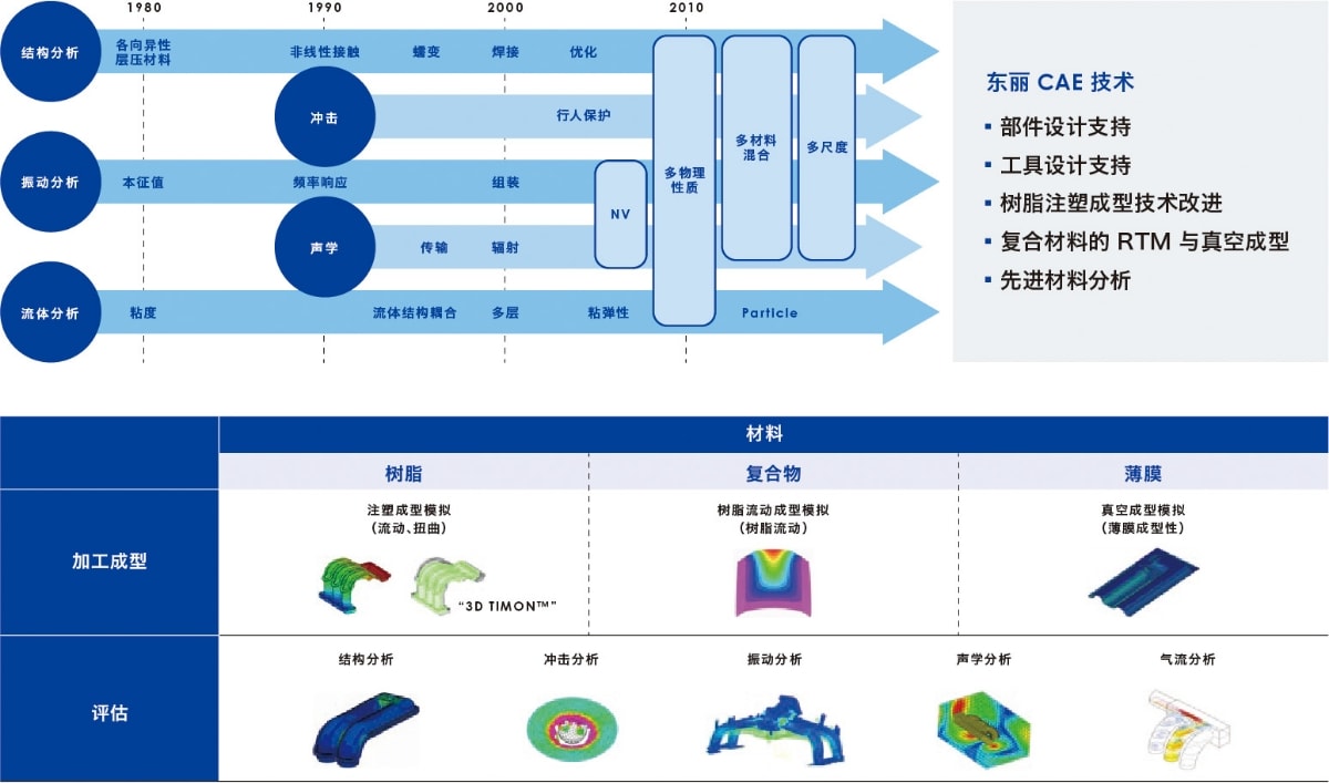 自 20 世纪 70 年代起,东丽采用先进的CAE模拟技术帮助客户进行产品设计和成型指导,其内部自主开发的先进 CAE 软件也得到了成功的商业推广。