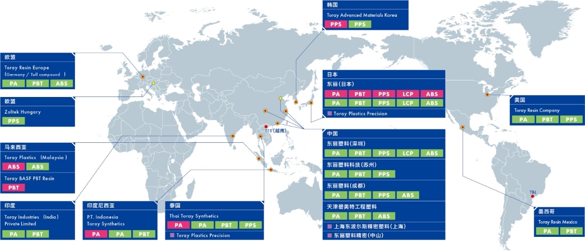东丽树脂事业部的业务已经扩展到在全球 11个国家,拥有21个技术中心和生产据点。