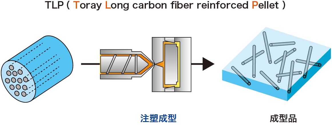 通常,碳纤维强化热塑性塑料的抗冲击性取决于碳纤维的长度,纤维长度越长,抗冲击性就越高。为此,Toray 开发了 TLP(Toray 长碳纤维强化颗粒),并一直在开发使用 ABS、PP、PA 和 PPS 等各种树脂作为基的材料,主要用于需要高强度和抗冲击性的应用,如汽车配件和家电部件。(图 1)
