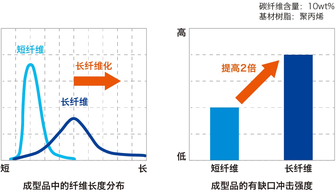 碳纤维的刚性导致其在注塑过程中会发生破裂,难以在成型品中保持足够的纤维长度,限制了其进一步提高抗冲击性能的能力。