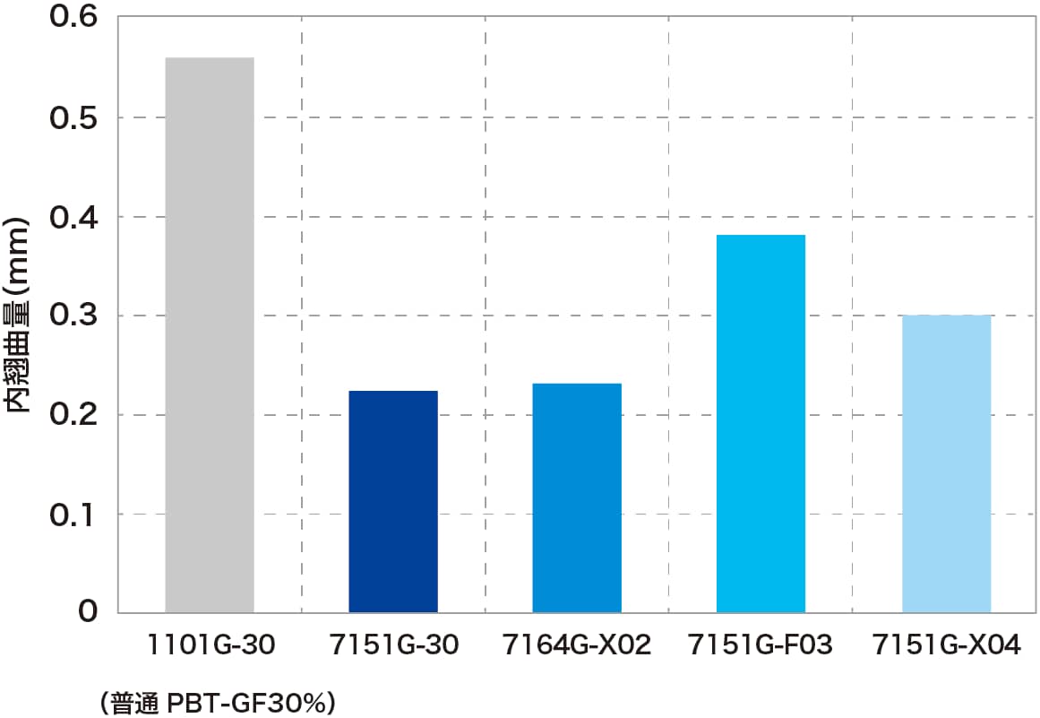 与普通 PBT 树脂相比,我们开发了可进一步降低翘曲度的材料,包括翘曲度显著降低的 7151G-30、兼具耐水解的7151G-X04以及兼具阻燃和耐水解的 7164G-X02。